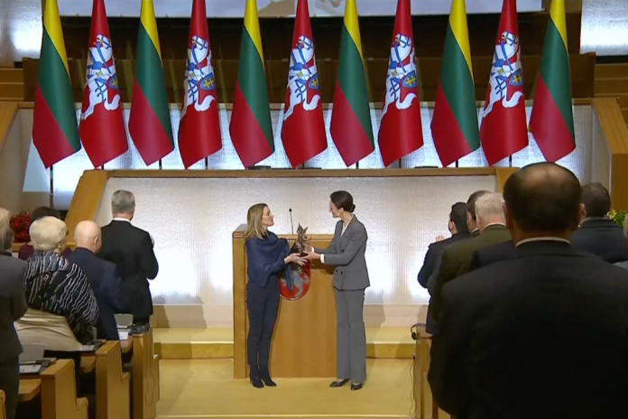 Le vendredi 12 janvier 2024, le Président de la République de Lituanie Gitanas Nausėda a décerné la Grand-Croix de l’Ordre du Grand-Duc de Lituanie Gediminas à la Présidente du Parlement européen Roberta Metsola «pour son leadership et sa volonté personnelle de consolider efficacement le soutien fort de la majorité des groupes politiques du Parlement européen sur des questions clés pertinentes pour l’agenda politique de l’Union européenne et de la Lituanie».
