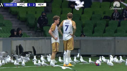Eli Adams, qui venait d’égaliser sur penalty (89e) pour Newcastle Jets, s’est retrouvé à jouer un coup franc particulier avec Lachlan Bayliss. Les deux hommes, près de la ligne de touche, étaient encerclés par les mouettes. Les oiseaux ont finalement fini par s’envoler et le score n’a lui pas bougé.