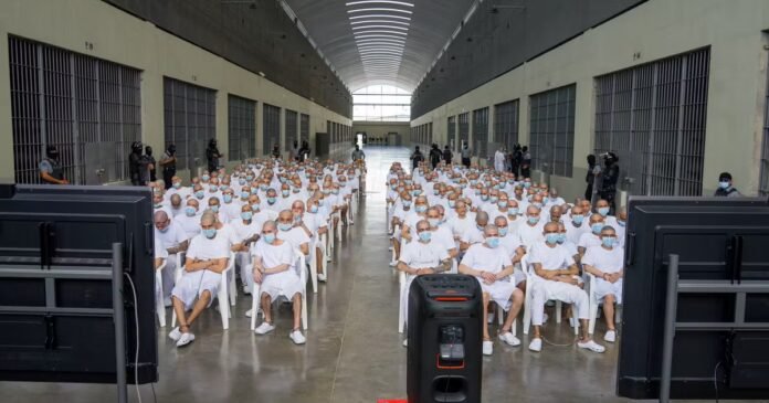 Plus de 90 000 personnes, soit 2 % de la population adulte, ont été arrêtées ces quatre dernières années, souvent sur la seule foi d’un témoignage ou à cause d’un tatouage. Près de la moitié a été enfermée dans le Cecot, vaste centre pénitentiaire construit ad hoc où 40 000 détenus sont entassés, entravés nuit et jour, sous des néons allumés en permanence. Après des années de détention, ils sont jugés lors de procès de masse présidés par des juges anonymes, comme celui qui a commencé le 20 avril.